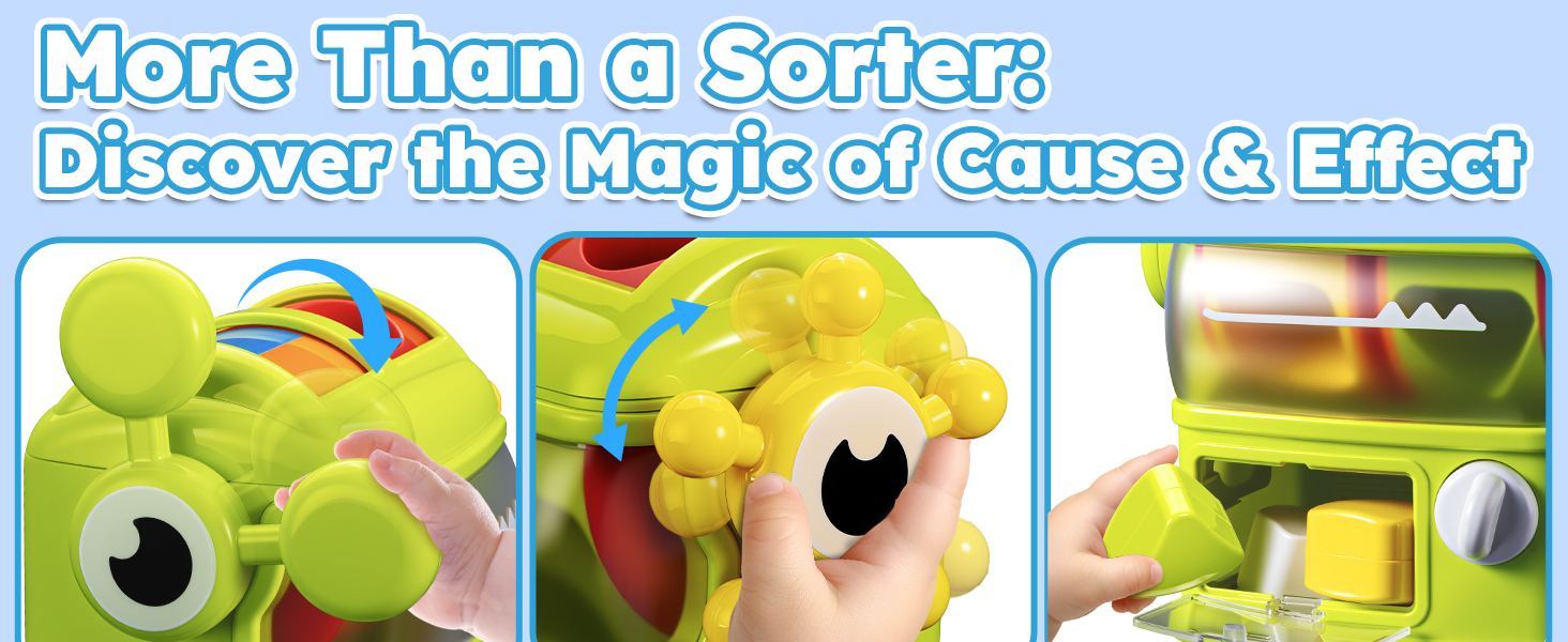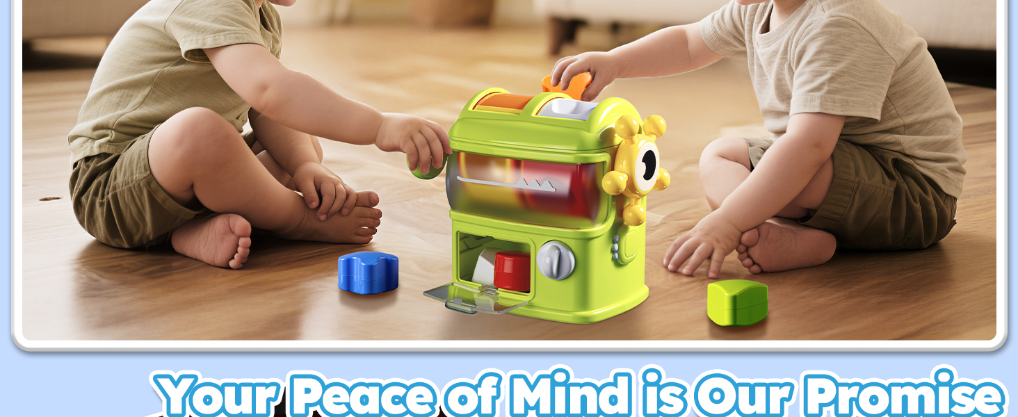 - 【Ceaseless Joy】When toddlers pull the lever or turn the steering wheel, the shape blocks will drop into the storage compartment below. By rotating the knob to open the flip-up lid, little ones can take out the blocks and enjoy the shape-sorting fun all over again