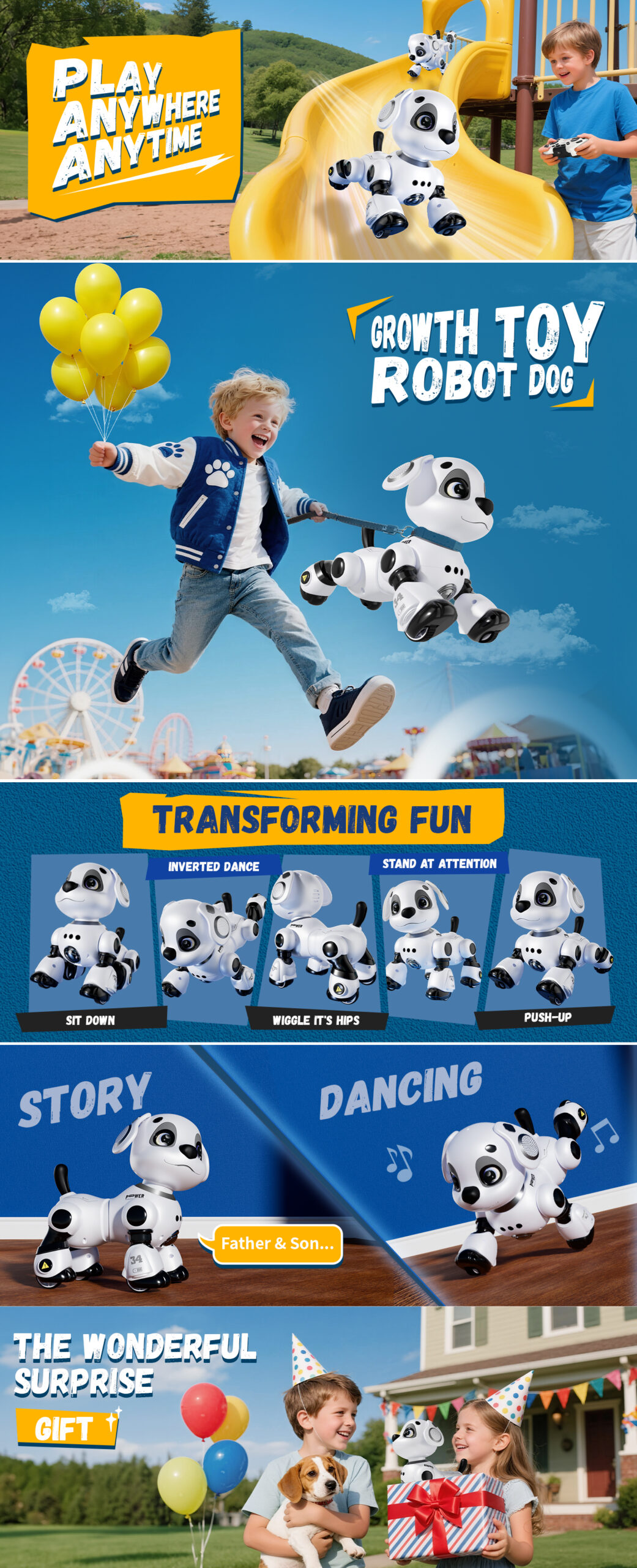 【Cool Sound & Light】Built-in dynamic music, cool lighting effects and a story playback function add to the fun. The flexible joints of the robot dog ensure it can perform various actions & dances smoothly to the rhythm of the music