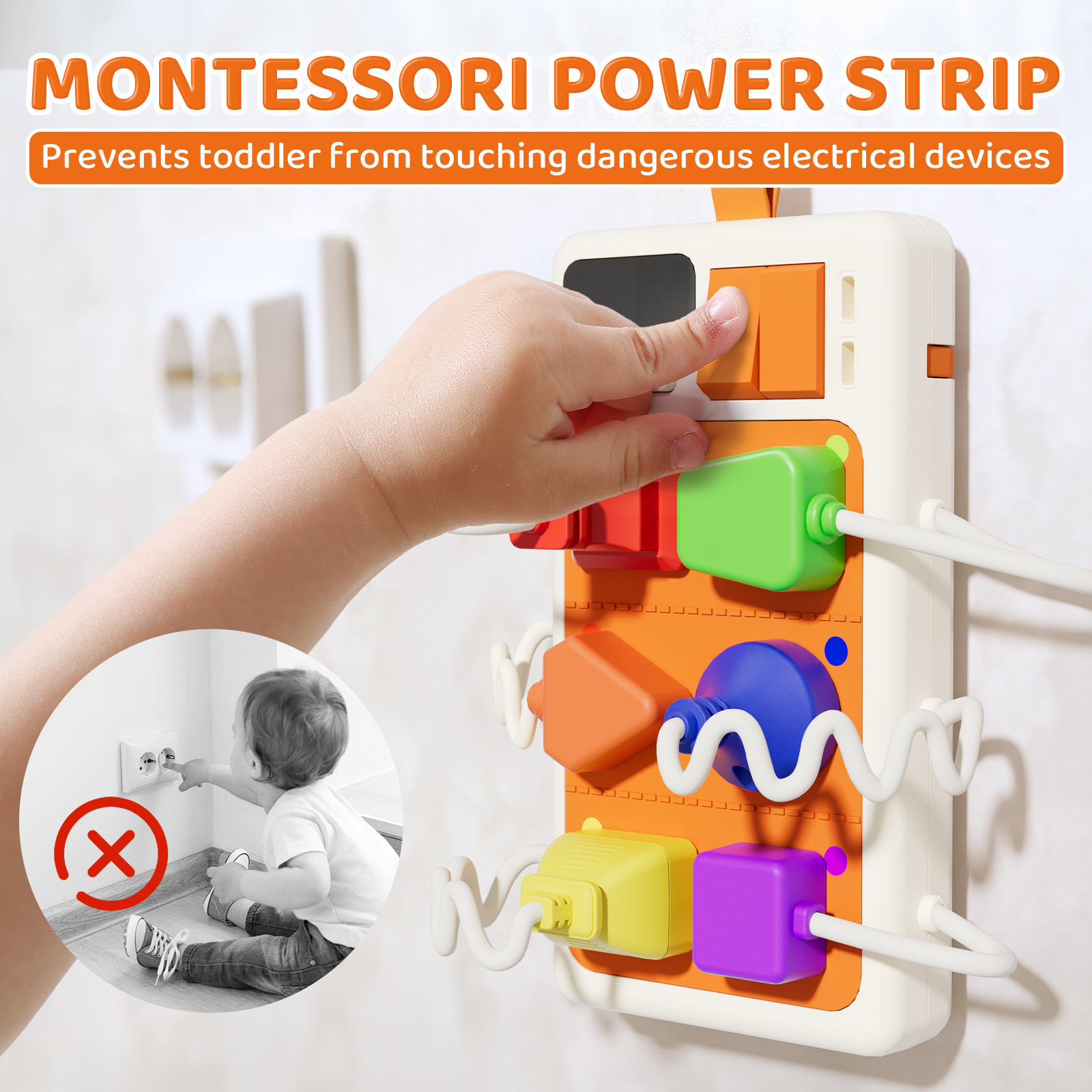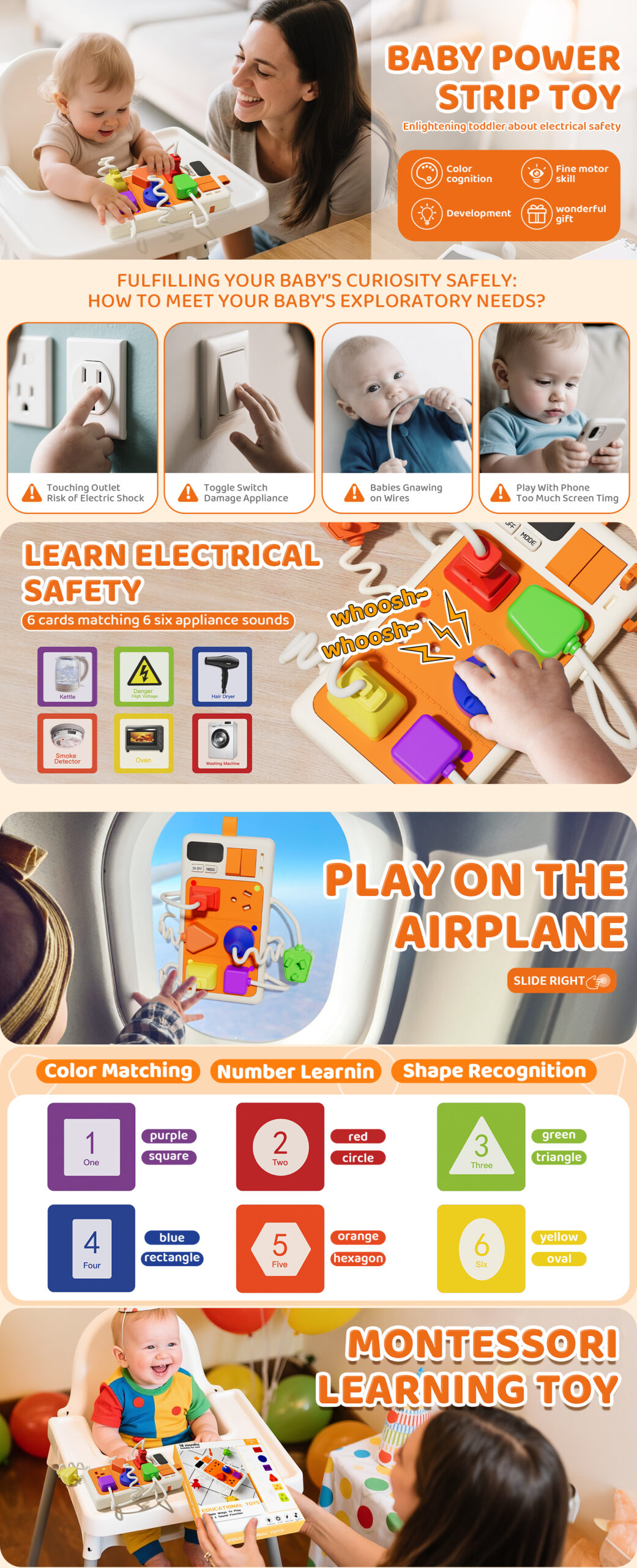 - 【Learn & Play】Includes 6 double-sided learning cards: One side helps toddlers learn color matching, number recognition & shape identification, while the other introduces different electrical appliances. This not only teaches safe electricity usage but also sparks their curiosity & exploration