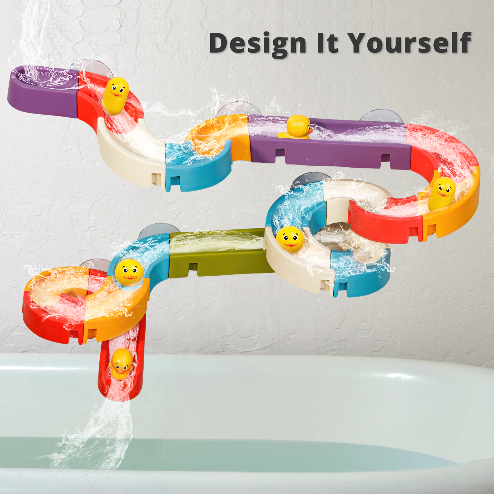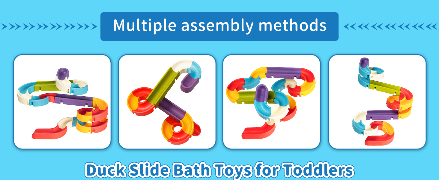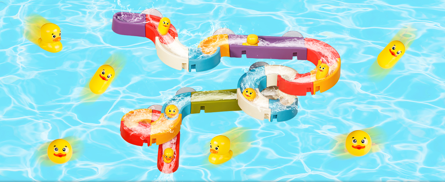 - 【DESIGN IT YOURSELF】There are 34 pieces in this bathtub toy set, including the suctions and the ducks. Yet you can design the tracks in many turns or straight, up or down, left or right. Do it with your imagination! Creative bath toys for toddlers age 3+.