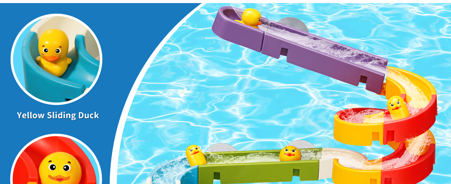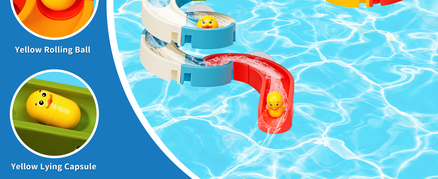 - 【YELLOW SLIDING DUCKS】Upgraded Version with Stainless Steel. Here you have 2 yellow ducks, 2 balls and 2 yellow capsules. You can use them to slide on the tracks you designed, just like marble run. Place them in the tub or wherever your kid wishs to play!