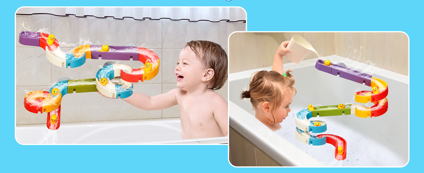 - 【BATH TOYS for TODDLERS】Upgraded Version with Stainless Steel. To build up such a toy on the wall of the bathroom, it needs your kid’s concentration. The work of designing a wall track will help your toddler to focus. Bath time becomes happier and fast!