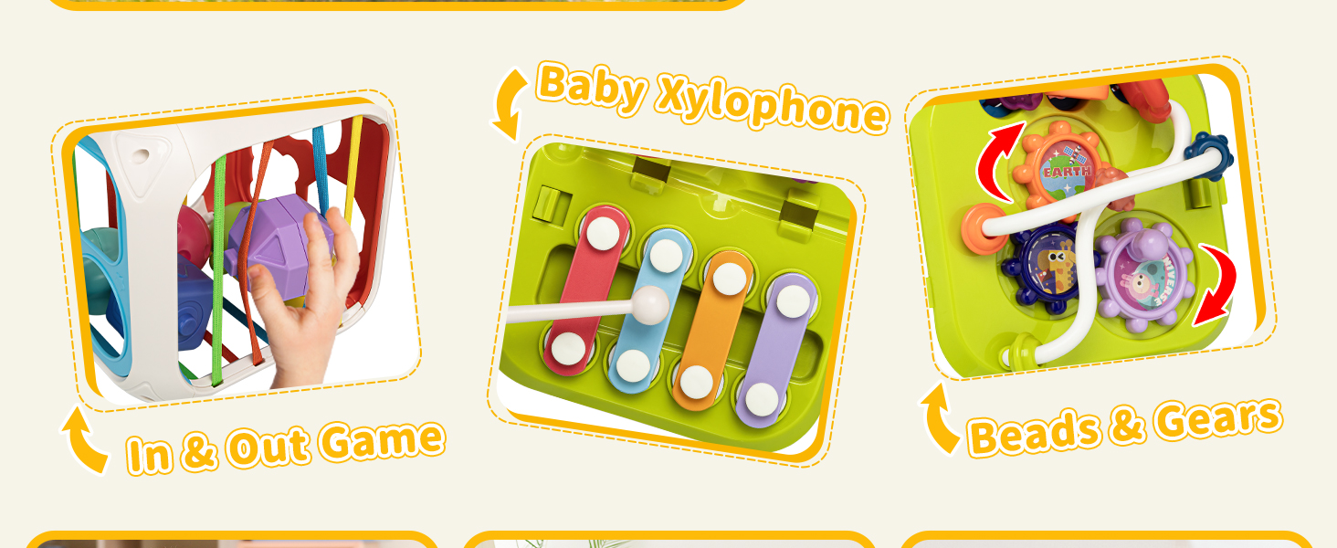 - 7-in-1 Montessori Toys for 1+ Year Old – In-out game with elastic rope, sorting and stacking, sensory pull string, baby xylophone, rotating beads and gears. BPA free.